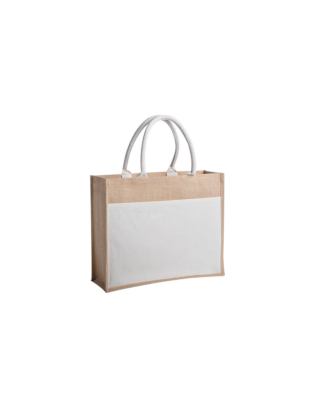 borsa shopping/mare juta e cotone manici lunghi imbottiti tasca frontale in cotone colore naturale Tecnica di stampa consigliata: Serigrafica - Transfer // Dimensione Articolo:cm 45x35x11 ca // Colore Articolo: Ecru // Materiale Articolo: juta e cotone