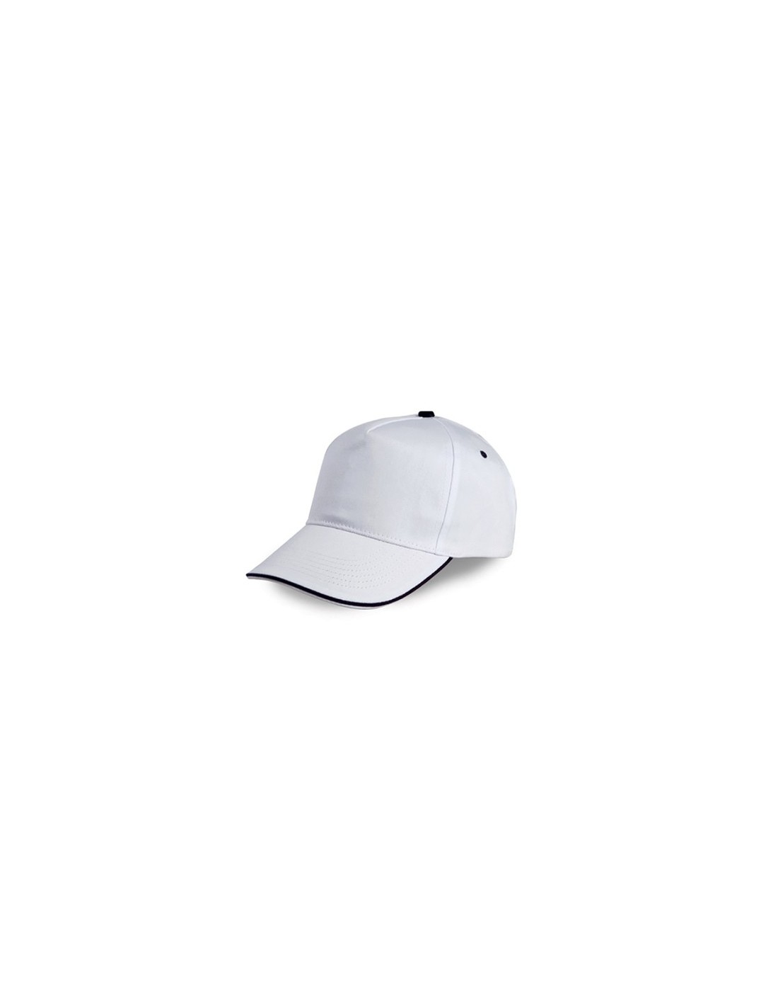 berretto 5 pannelli cotone twill 108/58 fascia tergisudore in colore abbinato occhielli ricamati frontalino rinforzato visiera rigida sagomata con piping a contrasto chiusura in velcro regolabile in colore abbinato colori reattivi colori piping: BI-GI piping blu navy AR-BL-NE-VS-RO-RY piping bianco // Dimensione Articolo: // Colore Articolo: Bianco // Materiale Articolo: 100% cotone