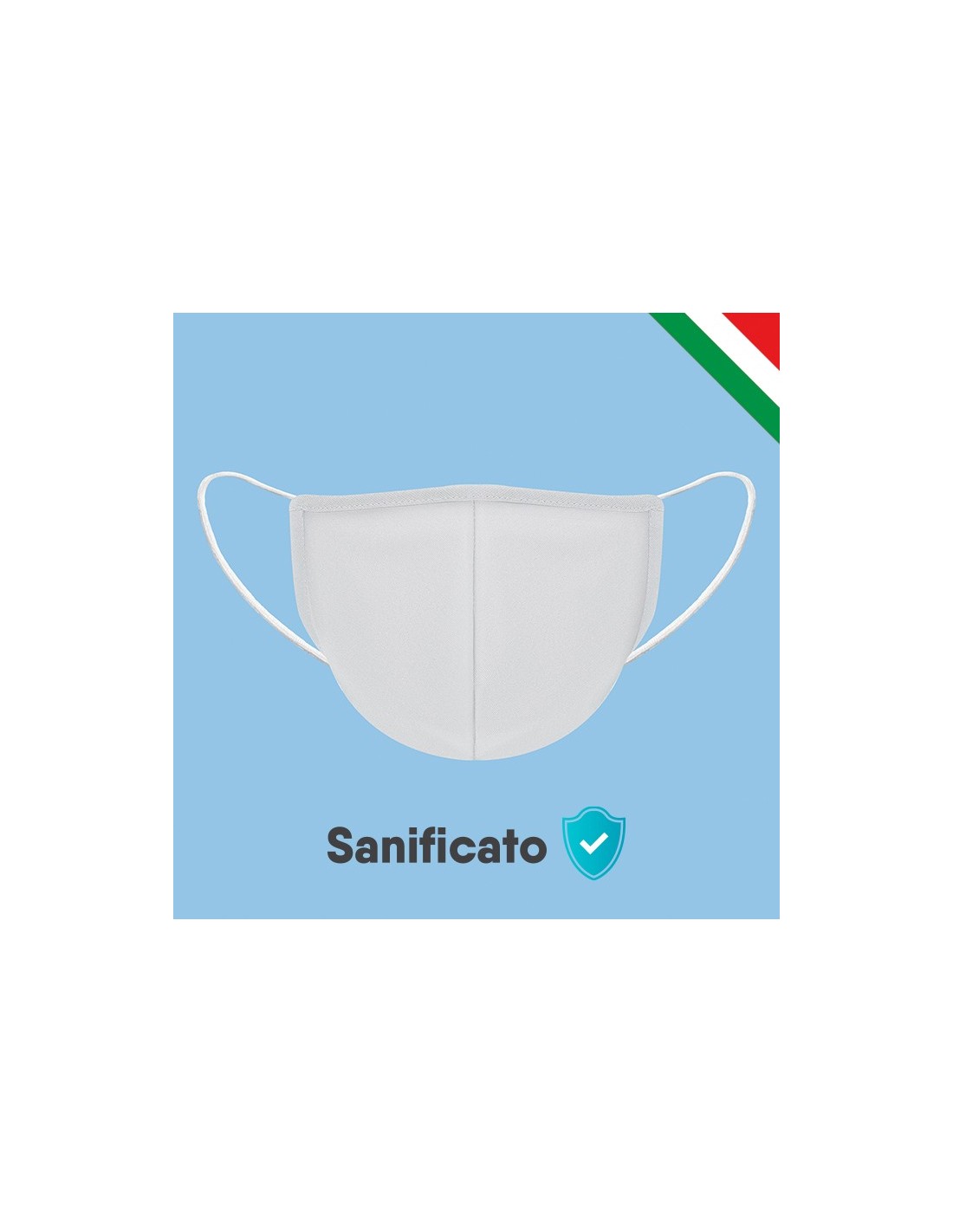 mascherine made in Italy prodotto sanificato esterno ed interno in 100% cotone interno in tnt idrorepellente lavabile e riutilizzabile elastico morbido regolabile certificati disponibili su richiesta cucitura parte superiore non è un dispositivo medico/sanitario spazio di stampa cm 8,5x10 ca per lato (larghezza per altezza)