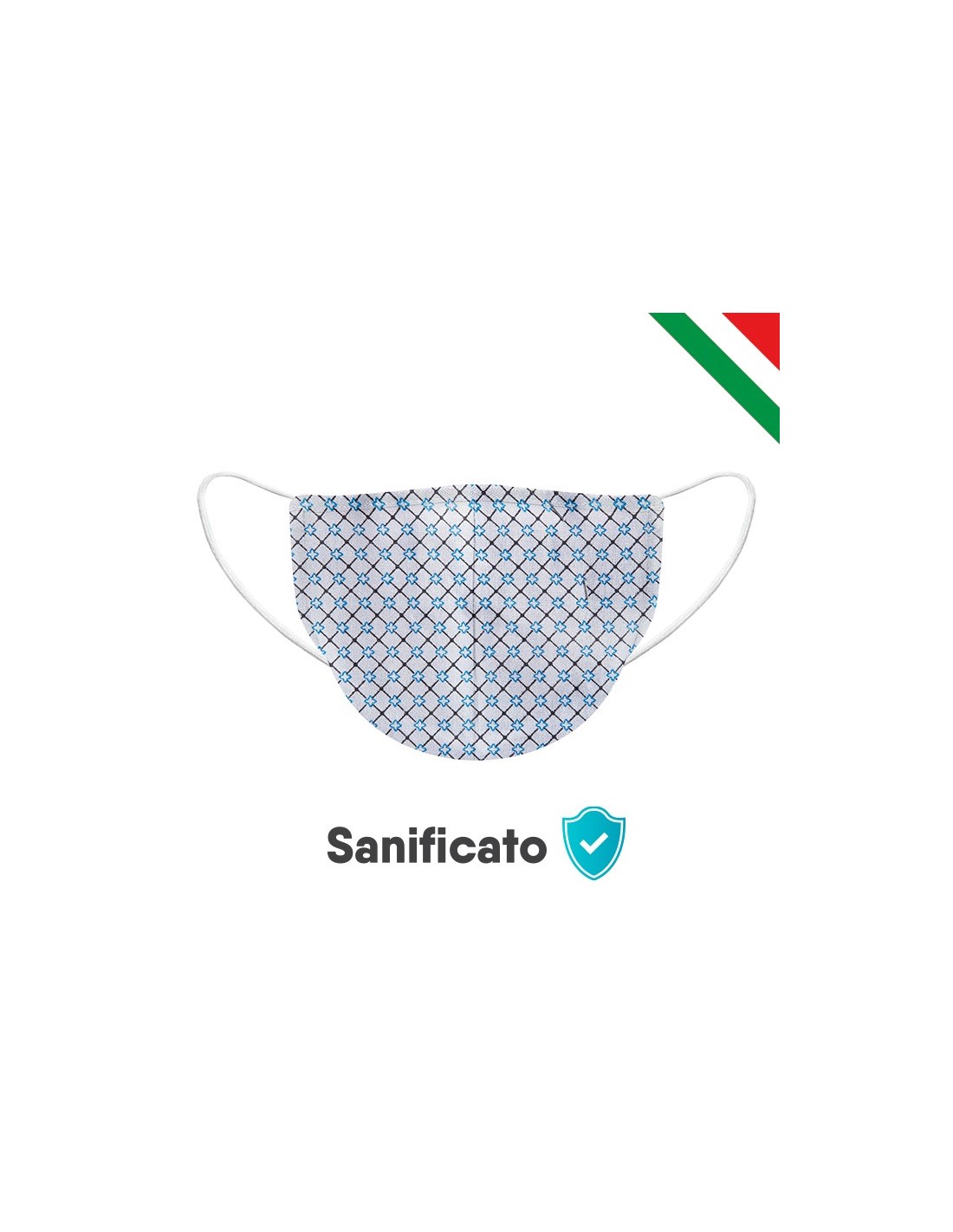 mascherine made in Italy prodotto sanificato esterno ed interno in 100% cotone interno in tnt idrorepellente lavabile e riutilizzabile elastico morbido regolabile certificati disponibili su richiesta certificati disponibili su richiesta cucitura parte superiore non è un dispositivo medico/sanitario spazio di stampa cm 8,5x10 ca per lato (larghezza per altezza)
