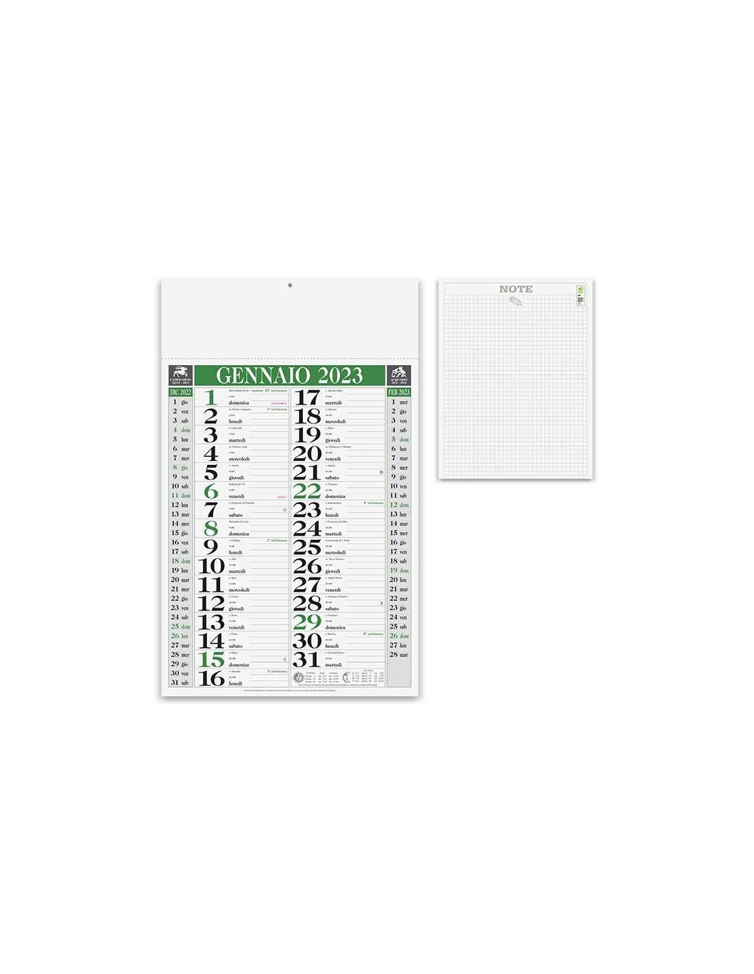 Edizione 2023 olandese mensile 12 fogli carta patinata 70 gr. testata termosaldata festività internazionali pagina note stampata sul retro tecnica di stampa consigliata: adesivo digitale - serigrafica // Dimensione Articolo:calendario: cm 29x47 ca testata: cm 29x9 ca // Colore Articolo: Verde // Materiale Articolo: