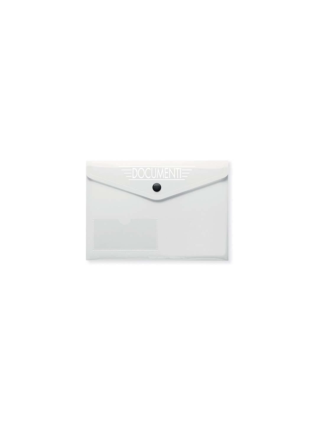 busta portadocumenti tasca esterna porta tessera chiusura con bottone nero tecnica di stampa consigliata: serigrafica // Dimensione Articolo:cm 21,7xh15,7 ca // Colore Articolo: Bianco // Materiale Articolo: pvc