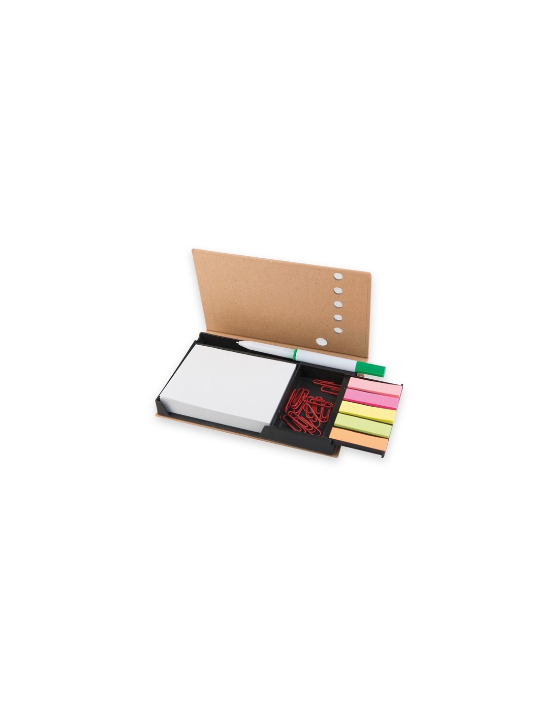 portacarte da scrivania contenitore in plastica blocco appunti 150 fogli bianchi 5 blocchi segnapagina colorati scomparto per graffette (incluse) penna telescopica a sfera refill inchiostro nero 2 alloggi portapenne tecnica di stampa consigliata: serigrafica - UV // Dimensione Articolo:cm 16,5xh2,2x10 ca // Colore Articolo: // Materiale Articolo: carta e plastica