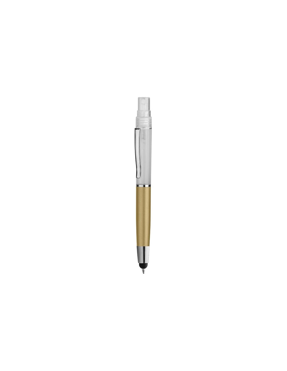 penna a sfera antibatterica gommino per touch screen contenitore per liquidi 4 ml facile da ricaricare liquido non incluso meccanismo a rotazione minuterie in metallo cromato refill inchiostro nero con sfera al tungsteno tecnica di stampa consigliata: tampografica - UV // Dimensione Articolo:Ø 1,4xh15,5 cm ca // Colore Articolo: Oro // Materiale Articolo: plastica