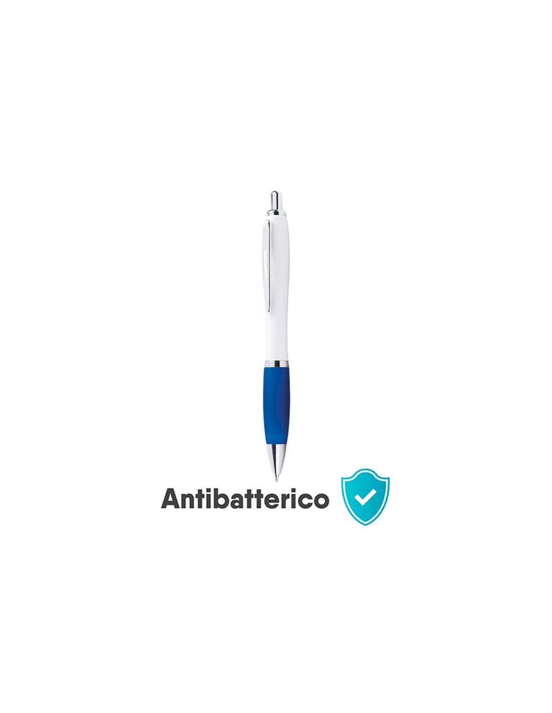 penna a sfera meccanismo a scatto corpo in plastica bianca grip colorata in gomma minuterie in metallo cromato refill jumbo con sfera al tungsteno inchiostro nero tecnica di stampa consigliata: tampografica - UV // Dimensione Articolo:Ø cm 1,25xh14 ca // Colore Articolo: Blu // Materiale Articolo: plastica