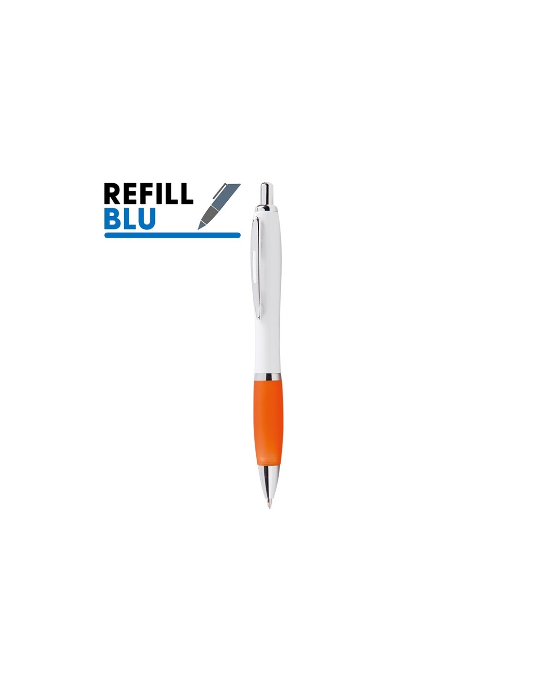 penna a sfera meccanismo a scatto corpo in plastica bianca grip colorata in gomma minuterie in metallo cromato refill jumbo inchiostro blu tecnica di stampa consigliata: tampografica - UV // Dimensione Articolo:Ø cm 1,25xh14 ca // Colore Articolo: Arancio // Materiale Articolo: plastica