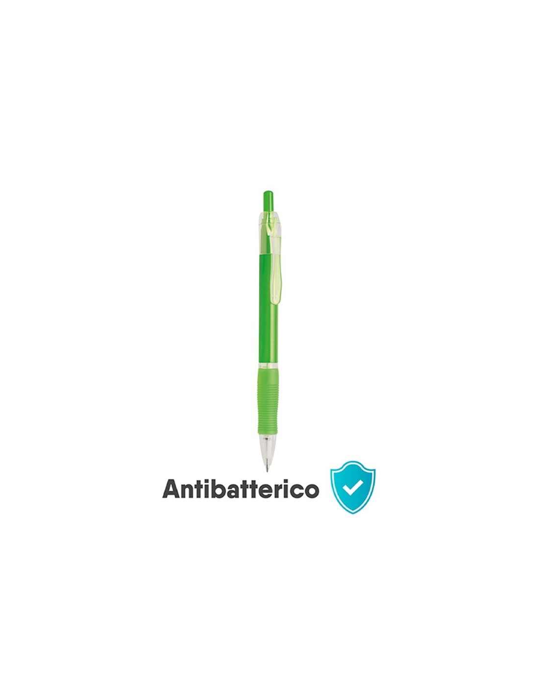 penna a sfera meccanismo a scatto corpo in plastica colorata grip colorata in gomma clip e minuterie in plastica trasparente refill con sfera al tungsteno inchiostro nero tecnica di stampa consigliata: serigrafica - tampografica - UV // Dimensione Articolo:Ø cm 1,05xh15 ca // Colore Articolo: Verde Lime // Materiale Articolo: plastica