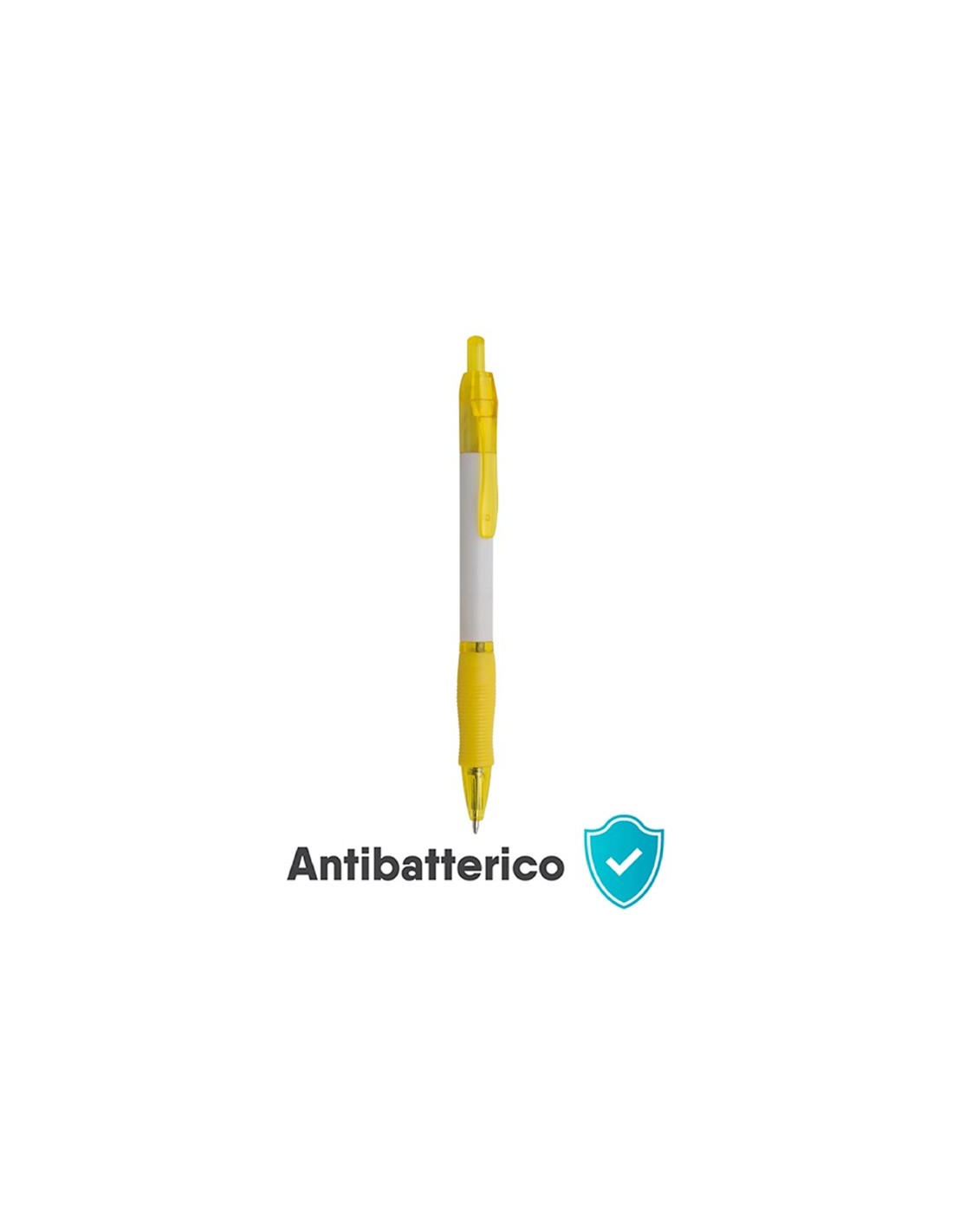 penna a sfera meccanismo a scatto corpo in plastica bianca grip colorata in gomma clip e minuterie in plastica trasparente colorata refill con sfera al tungsteno inchiostro nero tecnica di stampa consigliata: serigrafica - tampografica - UV // Dimensione Articolo:Ø cm 1,05xh15 ca // Colore Articolo: Giallo // Materiale Articolo: plastica