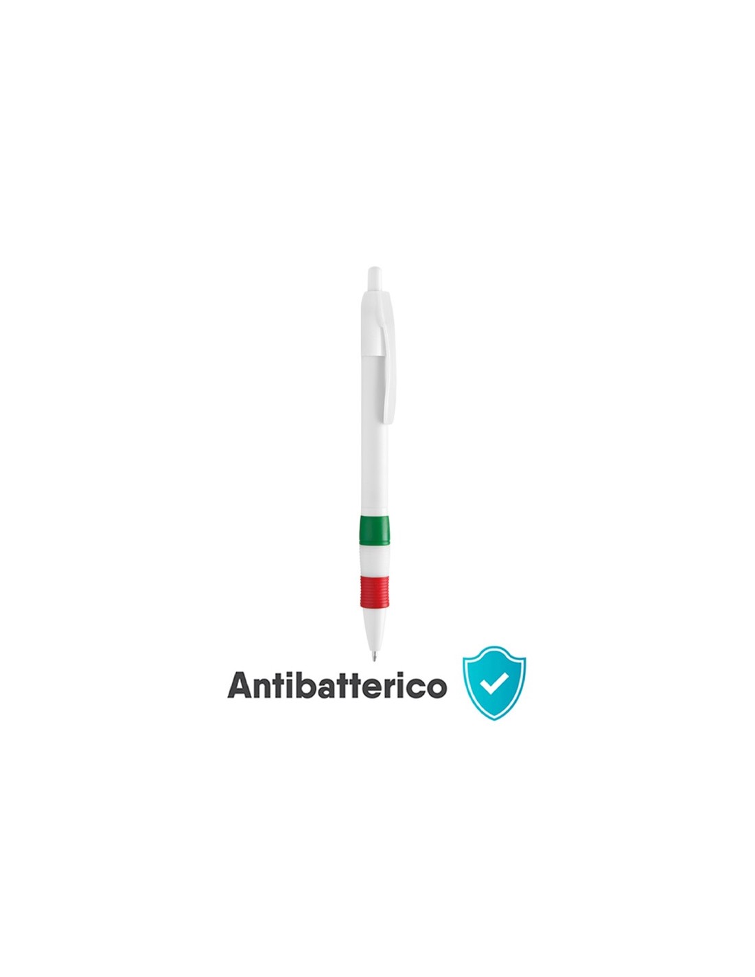 penna a sfera meccanismo a scatto corpo in plastica bianca grip colorata in gomma clip e minuterie in plastica trasparente colorata refill con sfera al tungsteno inchiostro nero tecnica di stampa consigliata: serigrafica - tampografica - UV // Dimensione Articolo:Ø cm 1,05xh15 ca // Colore Articolo: Italia // Materiale Articolo: plastica