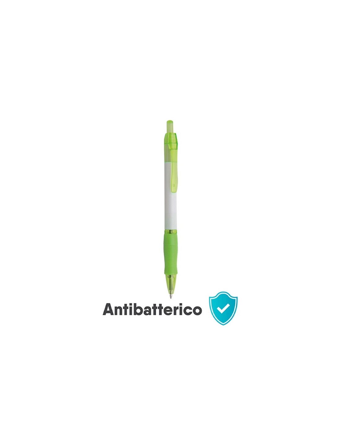 penna a sfera meccanismo a scatto corpo in plastica bianca grip colorata in gomma clip e minuterie in plastica trasparente colorata refill con sfera al tungsteno inchiostro nero tecnica di stampa consigliata: serigrafica - tampografica - UV // Dimensione Articolo:Ø cm 1,05xh15 ca // Colore Articolo: Verde Lime // Materiale Articolo: plastica