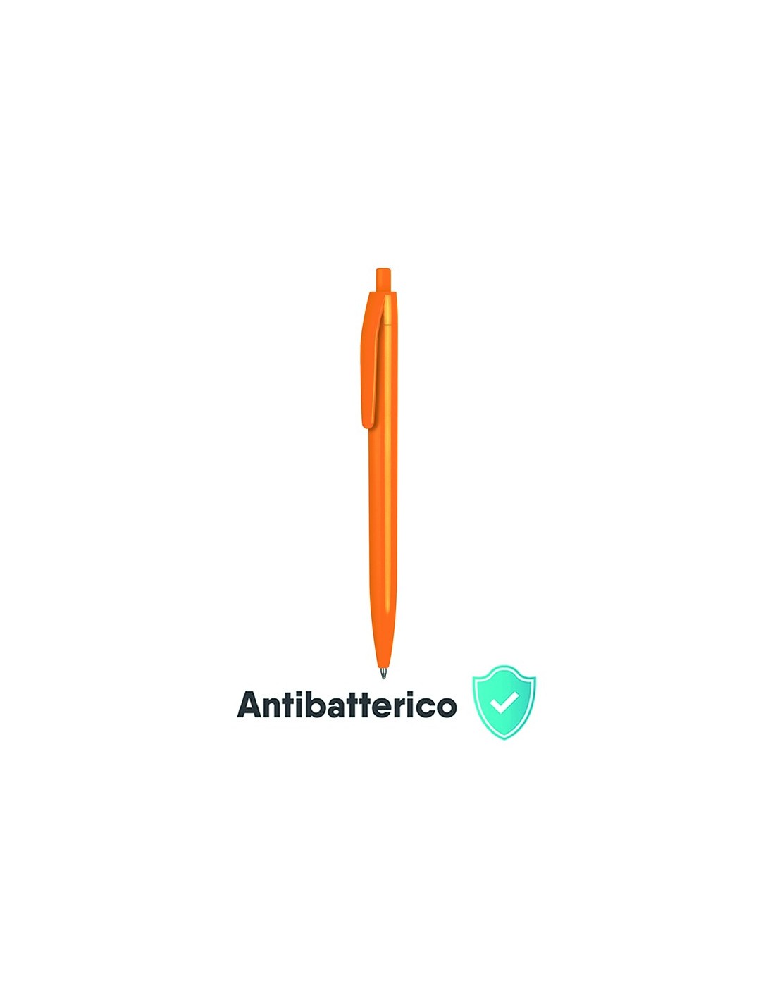 penna a sfera meccanismo a scatto corpo in plastica antibatterica colorata refill con sfera al tungsteno inchiostro nero tecnica di stampa consigliata: serigrafica - tampografica - UV // Dimensione Articolo:Ø cm 1,05xh14 ca // Colore Articolo: Arancio Fluorescente // Materiale Articolo: plastica