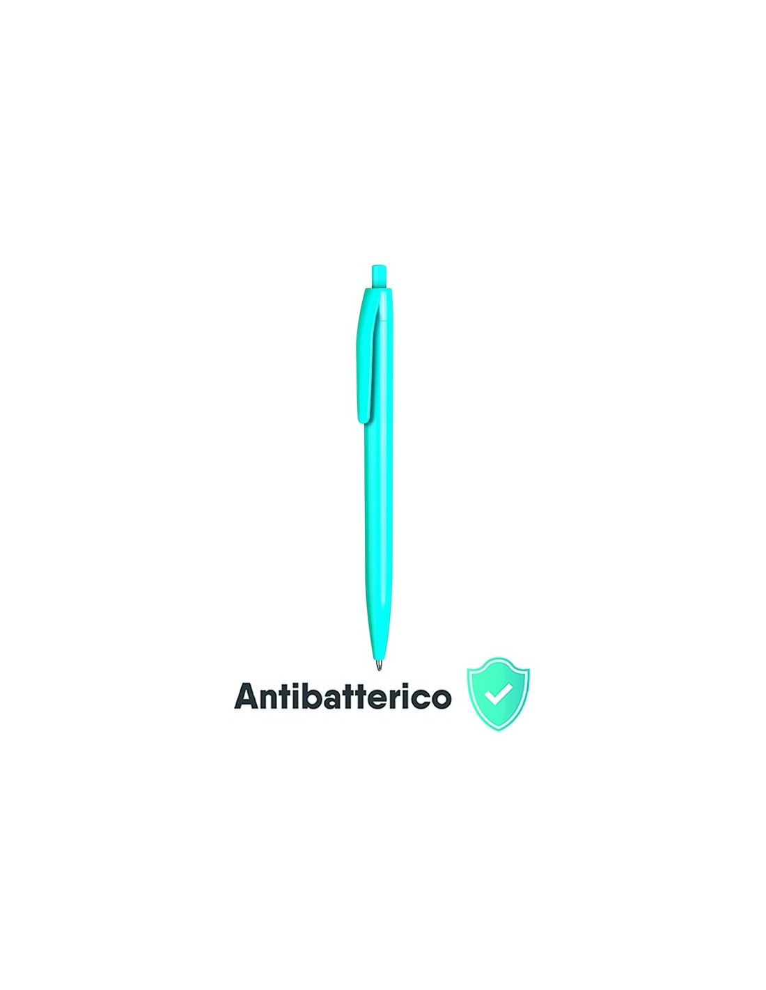 penna a sfera meccanismo a scatto corpo in plastica antibatterica colorata refill con sfera al tungsteno inchiostro nero tecnica di stampa consigliata: serigrafica - tampografica - UV // Dimensione Articolo:Ø cm 1,05xh14 ca // Colore Articolo: Azzurro // Materiale Articolo: plastica