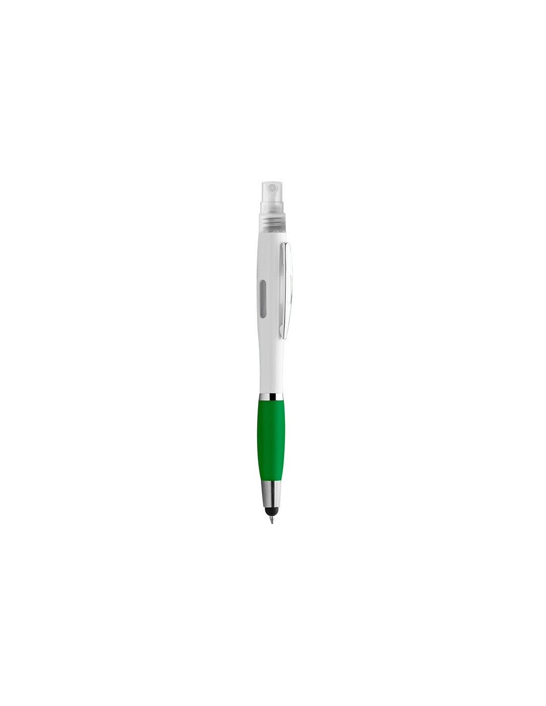 penna antibatterica a sfera touch contenitore per liquidi 4 ml liquido non incluso facile da ricaricare meccanismo a rotazione grip colorata in gomma minuterie in metallo cromato refill inchiostro nero tecnica di stampa consigliata: tampografica - UV // Dimensione Articolo:Ø cm 1,4xh16 ca // Colore Articolo: Verde // Materiale Articolo: plastica
