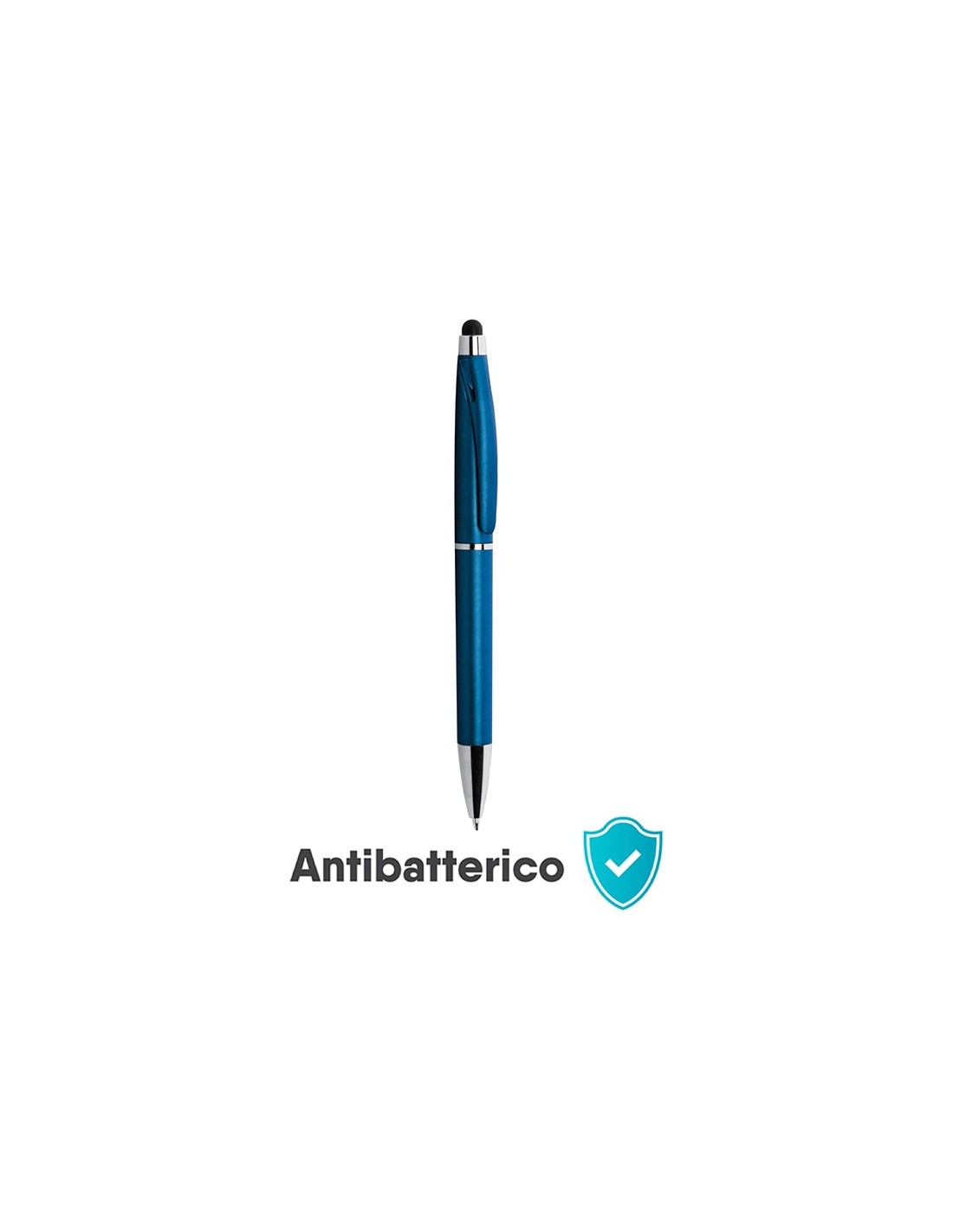 penna a sfera con gommino per touch screen meccanismo a rotazione minuterie in metallo cromato refill con sfera al tungsteno inchiostro nero tecnica di stampa consigliata: serigrafica - tampografica - UV // Dimensione Articolo:Ø cm 1,25xh14,5 ca // Colore Articolo: Blu // Materiale Articolo: plastica