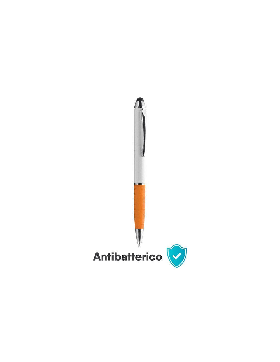 penna a sfera con gommino per touch screen meccanismo a rotazione grip in gomma minuterie in metallo cromato refill con sfera al tungsteno inchiostro nero tecnica di stampa consigliata: serigrafica - tampografica - UV // Dimensione Articolo:Ø cm 1,25xh13,6 ca // Colore Articolo: Arancio // Materiale Articolo: plastica e metallo