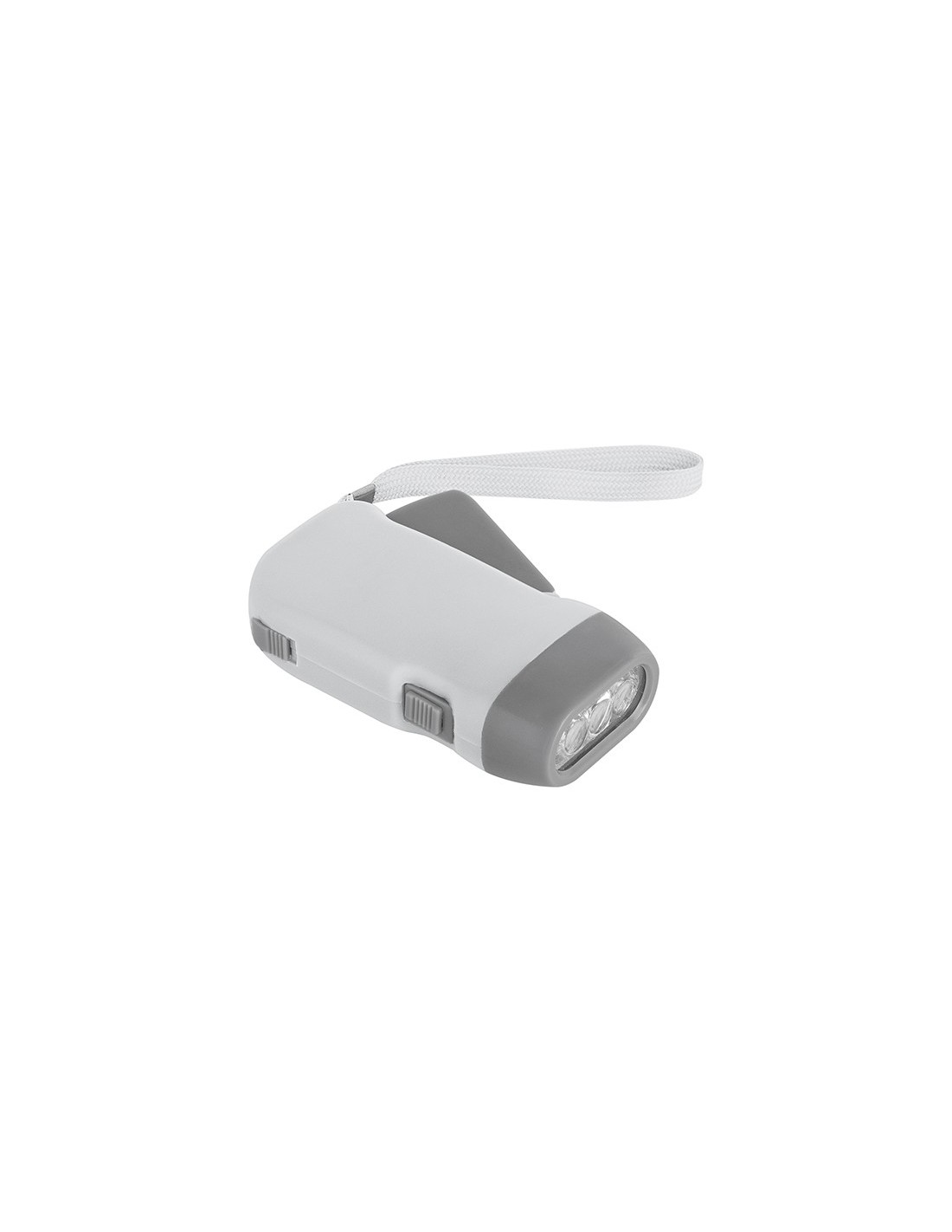 torcia ricaricabile con dinamo 3 led ad alta luminosità autoricarica mediante pressione della manopola tasto blocco/sblocco manopola corredato di astuccio tecnica di stampa consigliata: serigrafica - tampografica - UV // Dimensione Articolo:cm 10x5x2,5 ca // Colore Articolo: Bianco // Materiale Articolo: plastica