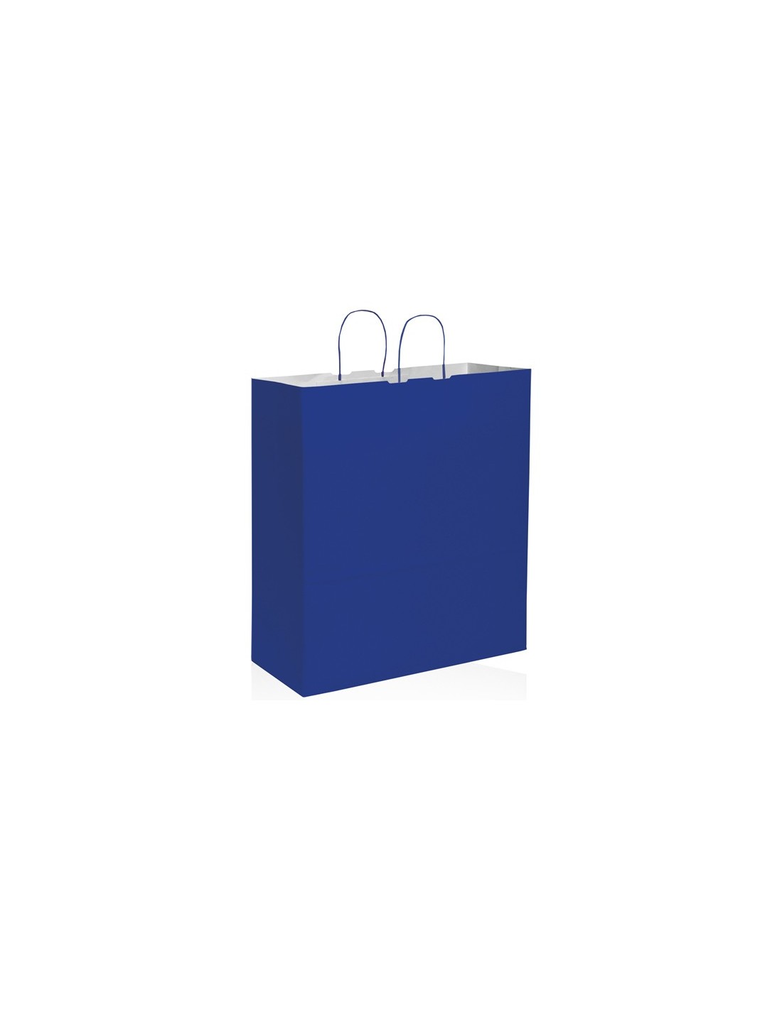 shopper con soffietto maniglia ritorta 100 gr/mq portata 9 kg tecnica di stampa consigliata: serigrafica // Dimensione Articolo:cm 36x41x12 ca // Colore Articolo: Blu // Materiale Articolo: carta kraft bianca
