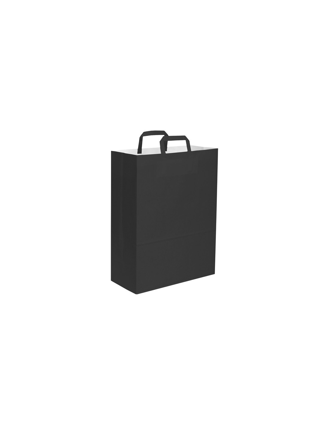 shopper con soffietto maniglia piatta 100 gr/mq portata 10 kg tecnica di stampa consigliata: serigrafica // Dimensione Articolo:cm 32x43x17 ca // Colore Articolo: Nero // Materiale Articolo: carta kraft bianca